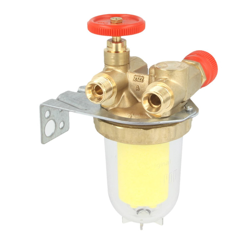 Filtre fioul Oventrop pour systèmes monotube avec retour, équipé d’une vanne d’arrêt, double joint torique et vanne de purge. Corps en laiton, chapeau zinc noir, godet Cellidor. Entrée droite/gauche possible. Plusieurs tamis disponibles. Raccords à bague de serrage côté brûleur à commander séparément.